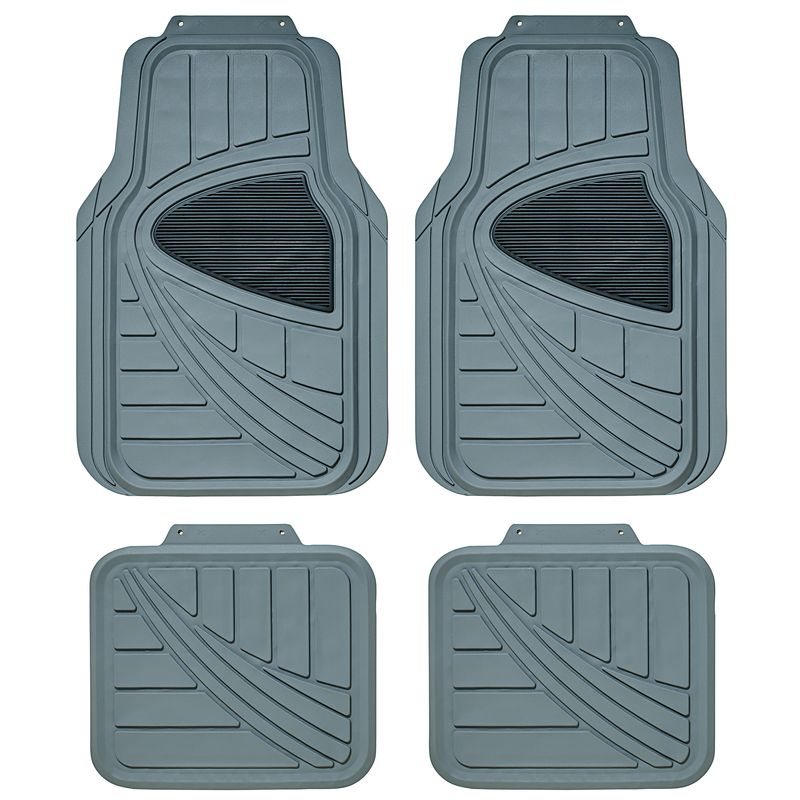 Conjunto universal de cuatro alfombrillas recortables en tres acabados para el coche, fabricadas con caucho resistente para una mayor durabilidad y un mejor lavado.