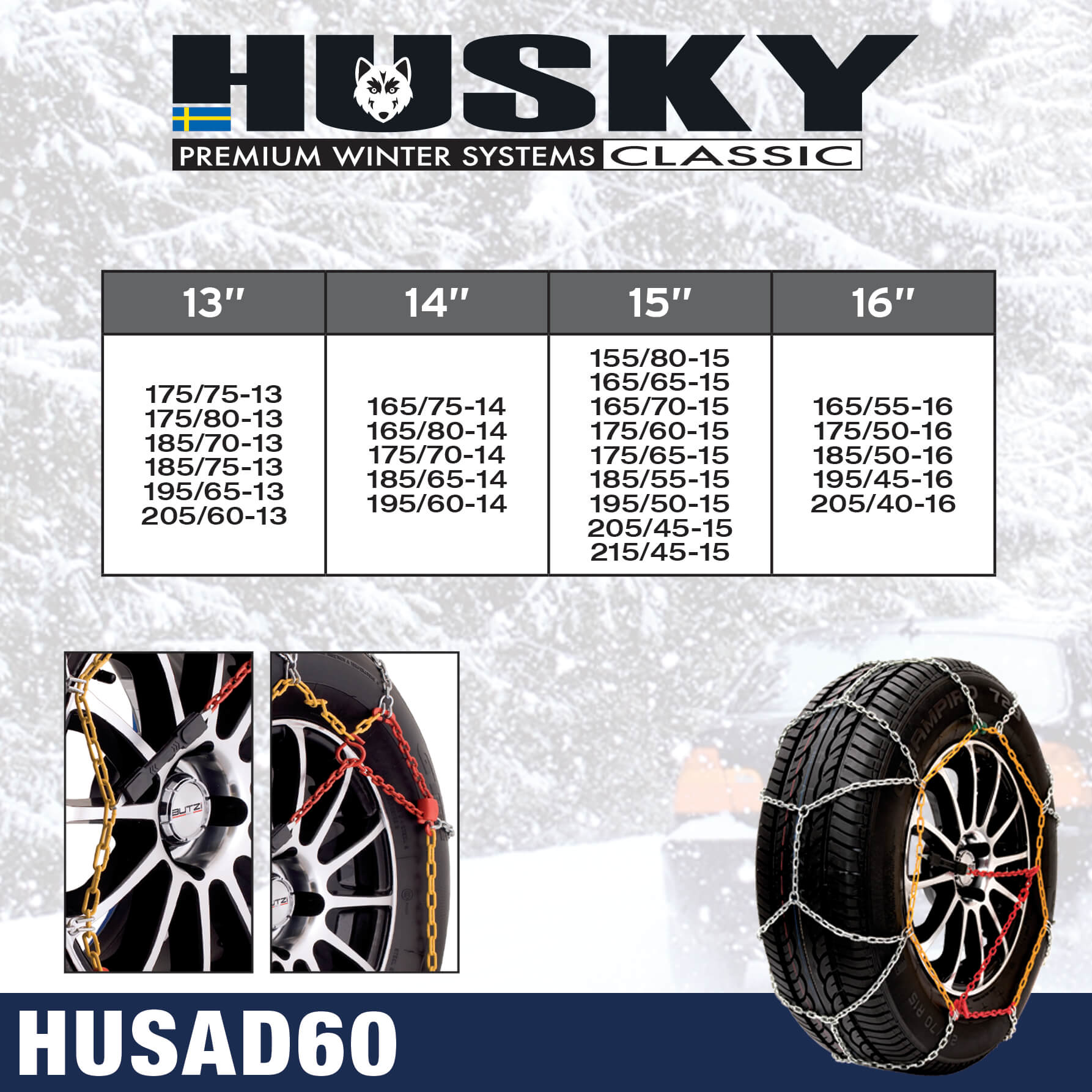 Si te gusta la nieve y sueles viajar con tu coche a lugares donde el clima es nevado, Sumex te presenta el modelo Husky Classic. Se trata de unas cadenas de acero de alta calidad con un grosor de 9mm. El diseño en forma de D de los anillos le dará un mayor agarre proporcionándole al mismo tiempo un rendimiento excelente. Mientras, el freno hará su función de forma más eficaz con trazados fiables. El cable de fijación tiene un diámetro de 3,5mm, lo cual asegura una posición óptima. Su tamaño permite colocarlas hasta en los maleteros con menos espacio y de esta manera, permanecer protegidas, gracias a la maleta de plástico ABS. Estas dos cadenas para las ACCESORIOS PARA RUEDAs de tracción disponen de un folleto de instrucciones para asegurarse de su eficiente colocación así como de unos guantes. Las cadenas de nueve Husky Classic están homologadas por TUV, GS, O-Norm V5117. Estas cadenas están disponibles en diferente medida para los diferentes neumáticos, por lo cual, dependiendo del tamaño del neumático deberá escoger la medida correspondiente. Revisar tabla de compatibilidad.