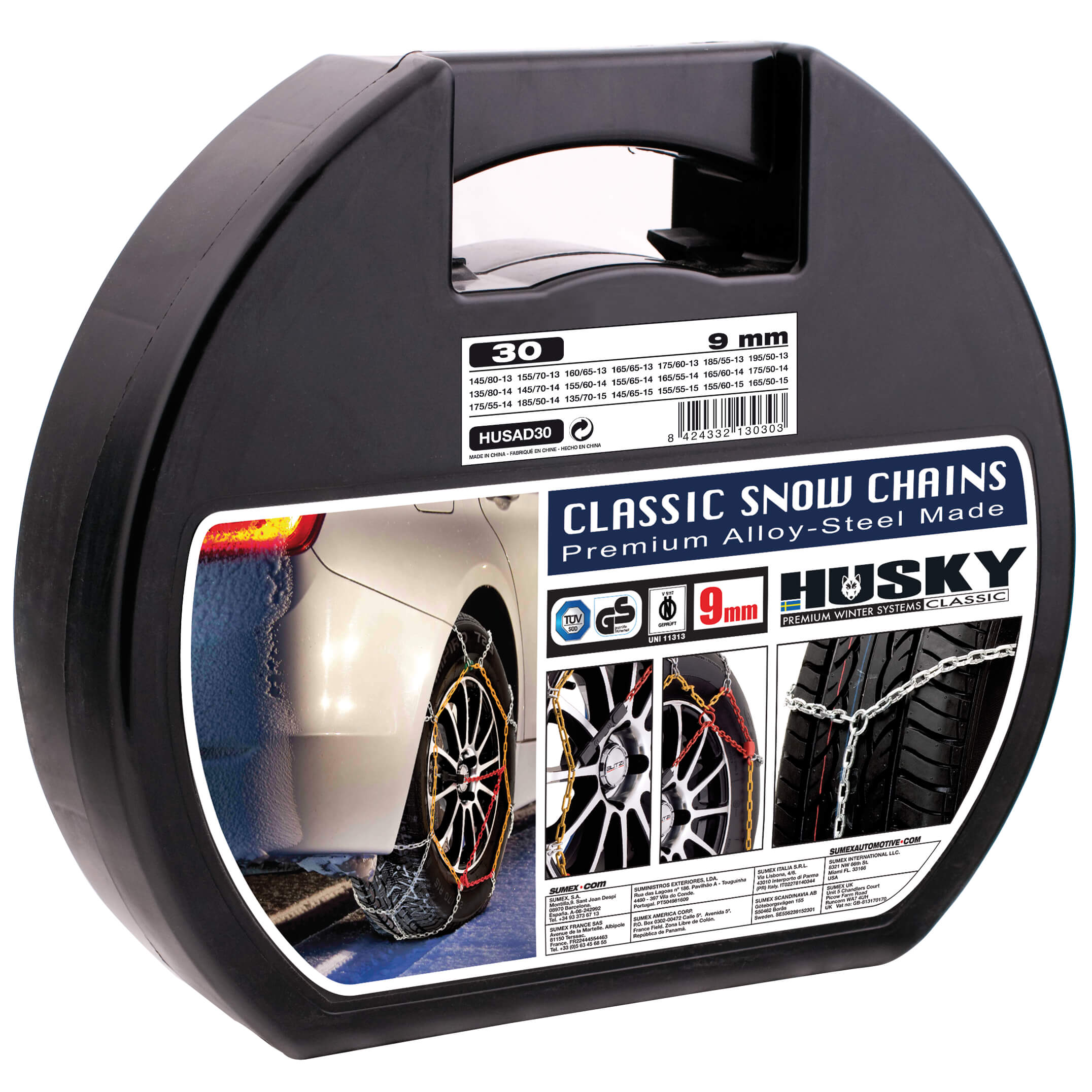 Si te gusta la nieve y sueles viajar con tu coche a lugares donde el clima es nevado, Sumex te presenta el modelo Husky Classic. Se trata de unas cadenas de acero de alta calidad con un grosor de 9mm. El diseño en forma de D de los anillos le dará un mayor agarre proporcionándole al mismo tiempo un rendimiento excelente. Mientras, el freno hará su función de forma más eficaz con trazados fiables. El cable de fijación tiene un diámetro de 3,5mm, lo cual asegura una posición óptima. Su tamaño permite colocarlas hasta en los maleteros con menos espacio y de esta manera, permanecer protegidas, gracias a la maleta de plástico ABS. Estas dos cadenas para las ACCESORIOS PARA RUEDAs de tracción disponen de un folleto de instrucciones para asegurarse de su eficiente colocación así como de unos guantes. Las cadenas de nueve Husky Classic están homologadas por TUV, GS, O-Norm V5117. Estas cadenas están disponibles en diferente medida para los diferentes neumáticos, por lo cual, dependiendo del tamaño del neumático deberá escoger la medida correspondiente. Revisar tabla de compatibilidad.