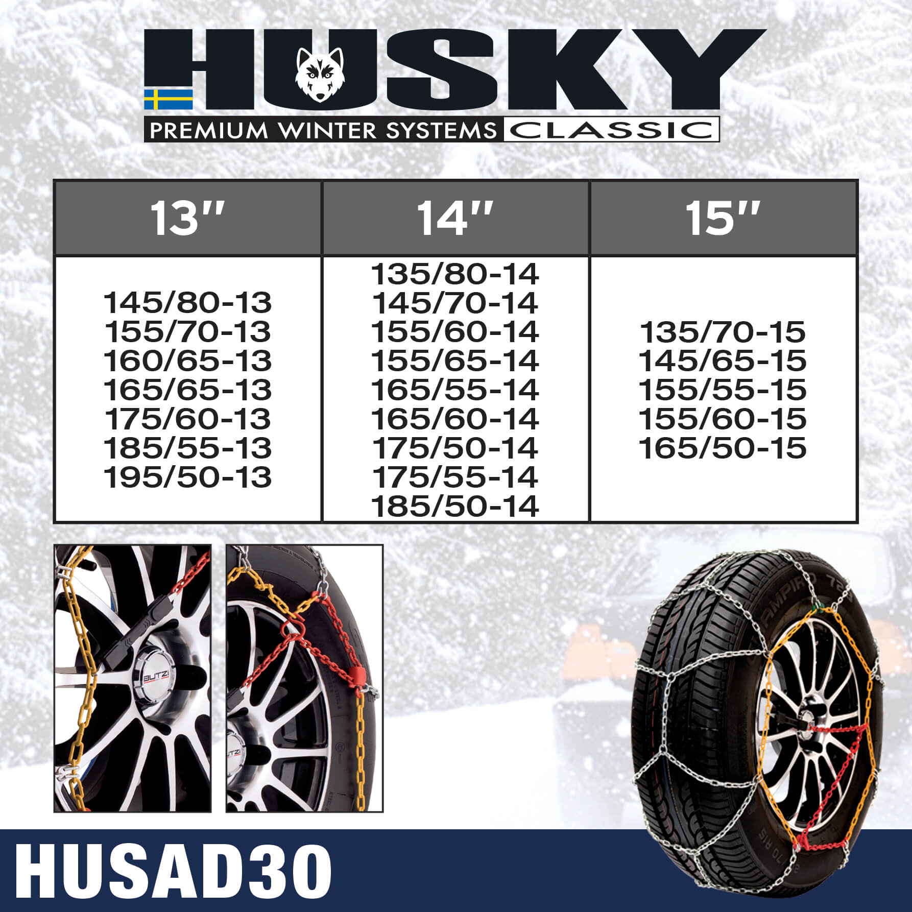 Cadenas de nieve del modelo Husky Classic en diferentes medidas según el tipo de neumático del cual disponga cada vehículo. Un accesorio esencial para aquellos que suelen viajar a zonas donde la nieve es abundante. Estas cadenas de nieve son seguras y fáciles de adaptarse a tus ACCESORIOS PARA RUEDAs.