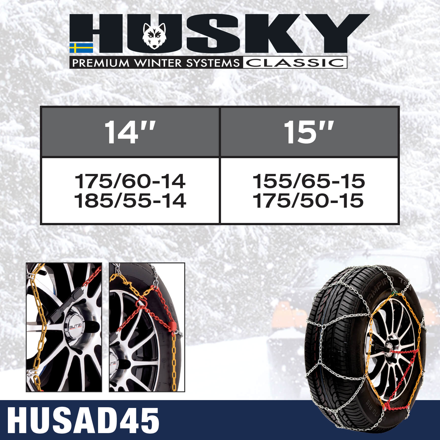 Cadenas de nieve del modelo Husky Classic en diferentes medidas según el tipo de neumático del cual disponga cada vehículo. Un accesorio esencial para aquellos que suelen viajar a zonas donde la nieve es abundante. Estas cadenas de nieve son seguras y fáciles de adaptarse a tus ACCESORIOS PARA RUEDAs.