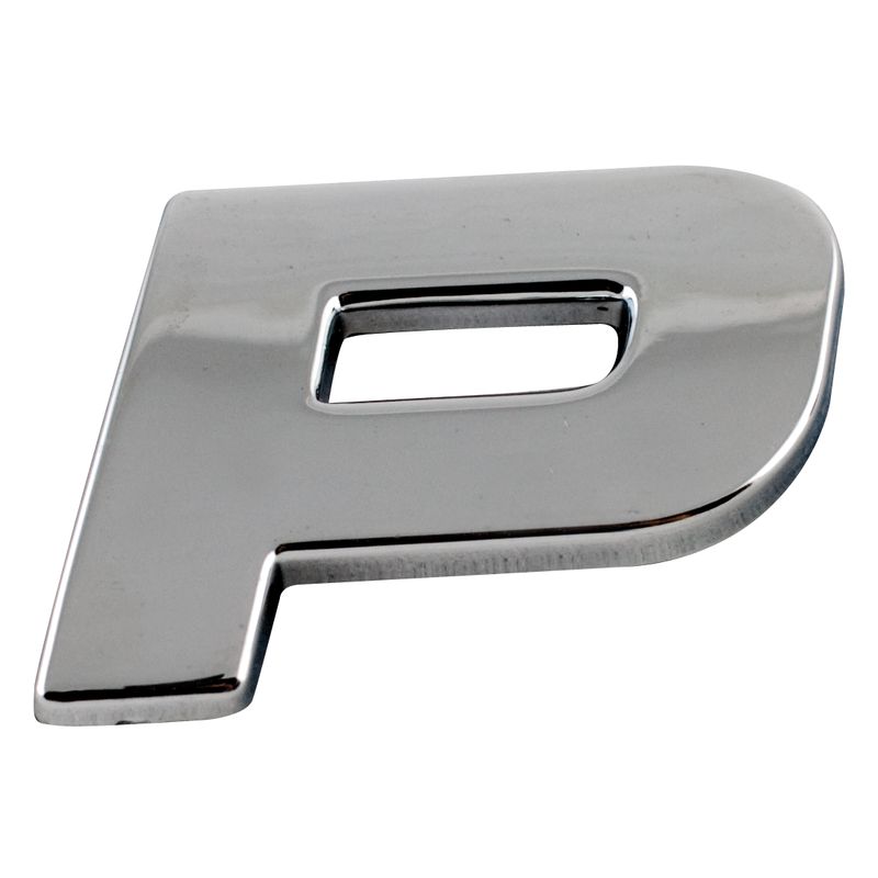 Emblema Símbolo P cromado con base adhesiva, ideal para colocarlo en la parte lateral ACCESORIOS DE EXTERIOR del vehículo. Su fabricación con material ABS favorece la impermeabilidad y durabilidad en el vehículo.