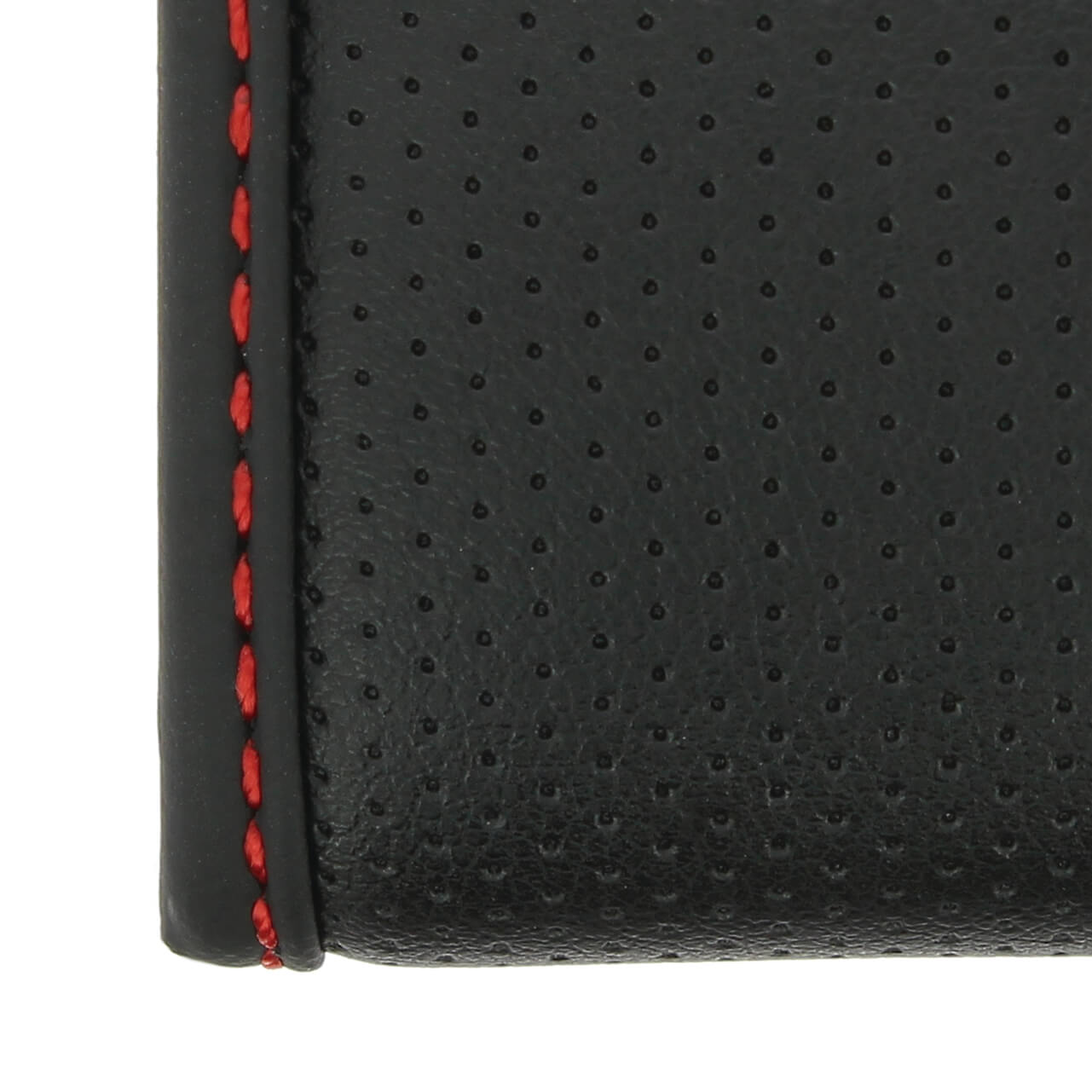 Funda para volantes de 35-36 cm de dimensión, base negra con agujeros LITTLE HOLES, ribete negro, cosido rojo, una funda que le proporcionará a tu vehículo una calidad efectiva de protección y comodidad, así como le dará un aspecto elegante a tu volante.