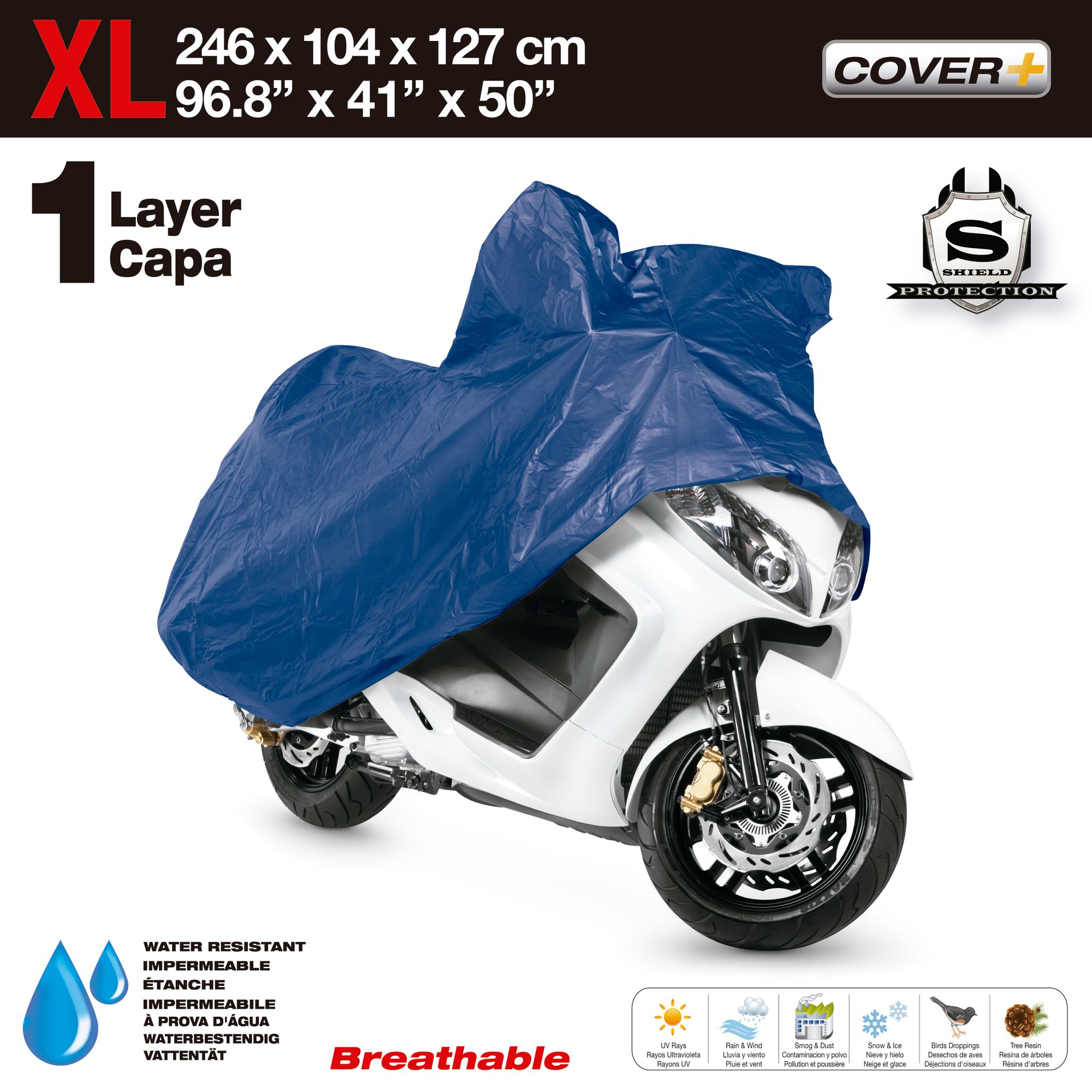 Funda para moto en distintas medidas a elegir según lo requerido, a fin de conservarla y mantenerla en buen estado. Esta funda dispone de un sistema de doble capa donde la capa ACCESORIOS DE EXTERIOR es de una mezcla de pollietileno (60%) y polipropileno (40%) que proporcionan un carácter impermeable de la funda y en la misma línea es resistente al hielo, lluvia, rayos UVA, excrementos de ave y resina de árbol. Mientras que la capa ACCESORIOS DE INTERIOR de algodón impide las ralladuras que se puedan producir y proporciona un grado superior de protección. Esta funda dispone de un sistema de ventilación que evita que se cree una atmósfera de humedad y por lo tanto, se produzca la aparición de moho. Su parte delantera permite introducir en candado de la moto sin ninguna dificultad gracias a su apertura. Una vez decidas prescindir de su uso, podrás guardarla en la bolsa de nailon con asa a fin de que el almacenamiento de la misma sea de alta protección.