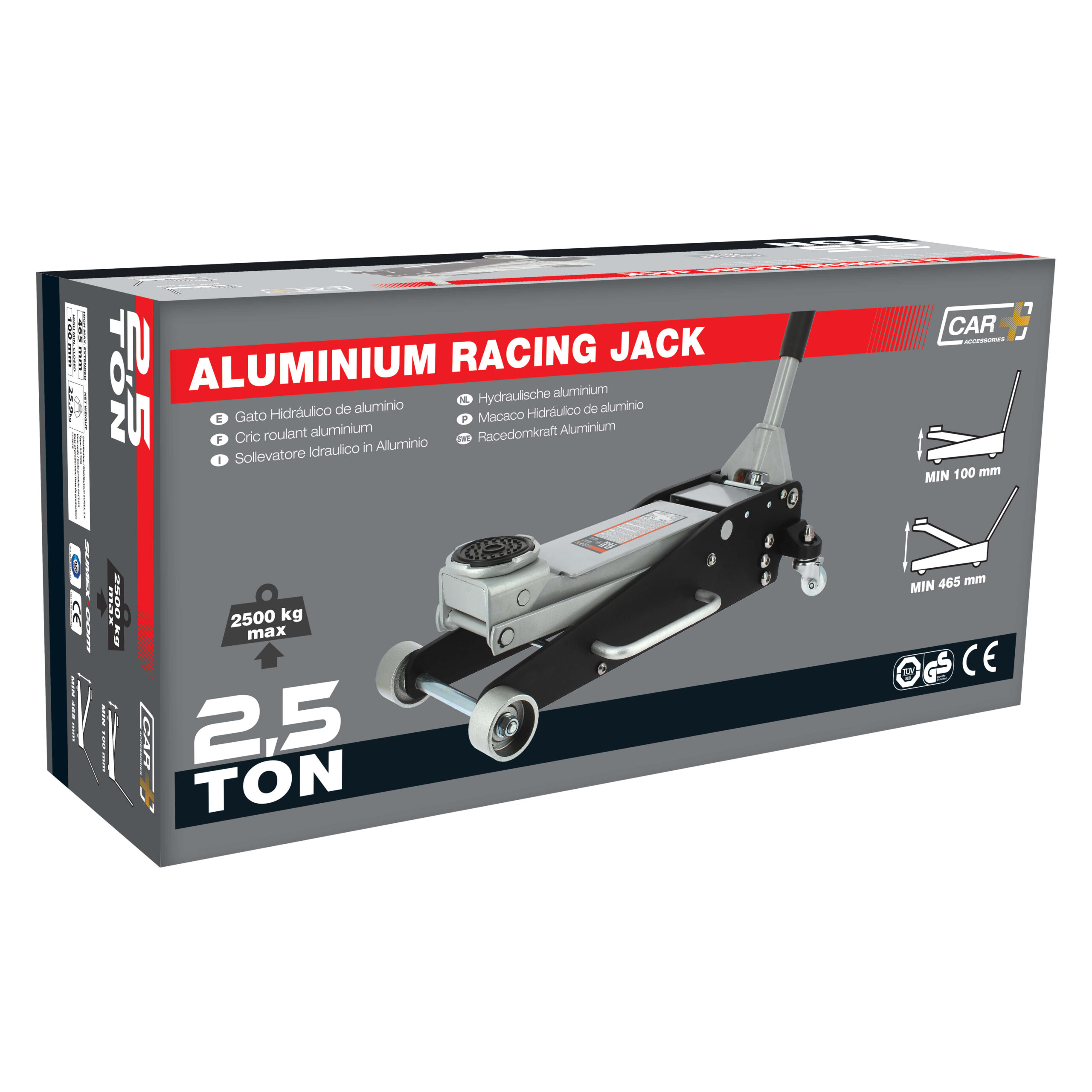Gato hidráulico de aluminio con capacidad de soporte de hasta 2,5 toneladas, donde la elevación mínima es de 100mm y una máxima de 465mm. Este gato es capaz de elevar hasta coches con perfil bajo y permite almacenarlo gracias al poco espacio que ocupa el mango. La calidad con la cual ha sido fabricado este producto le permite destacar con respecto a los gatos tradicionales, por ello dispone de homologación TUV y GS lo cual significa que cumple las expectativas con respecto a la calidad exigida por la UE o EEUU.