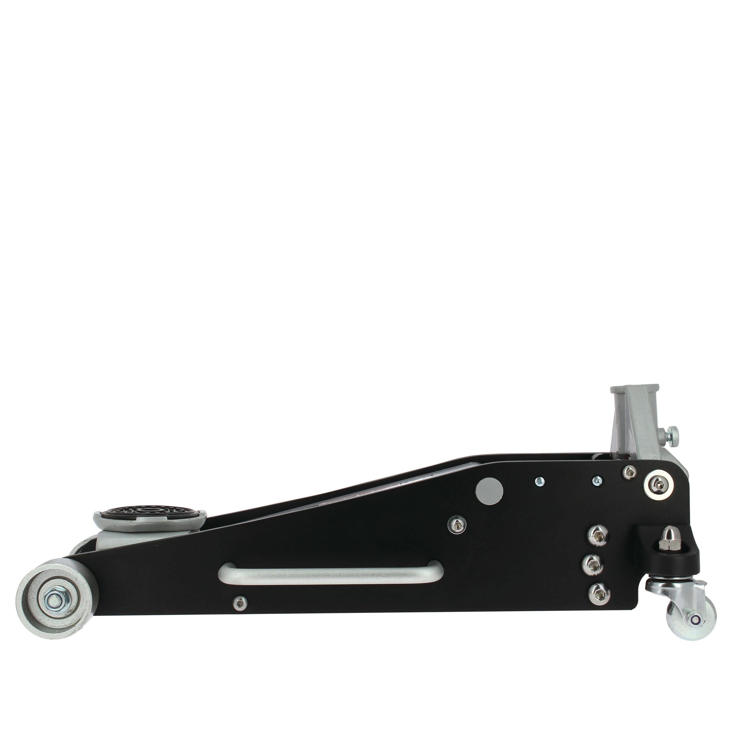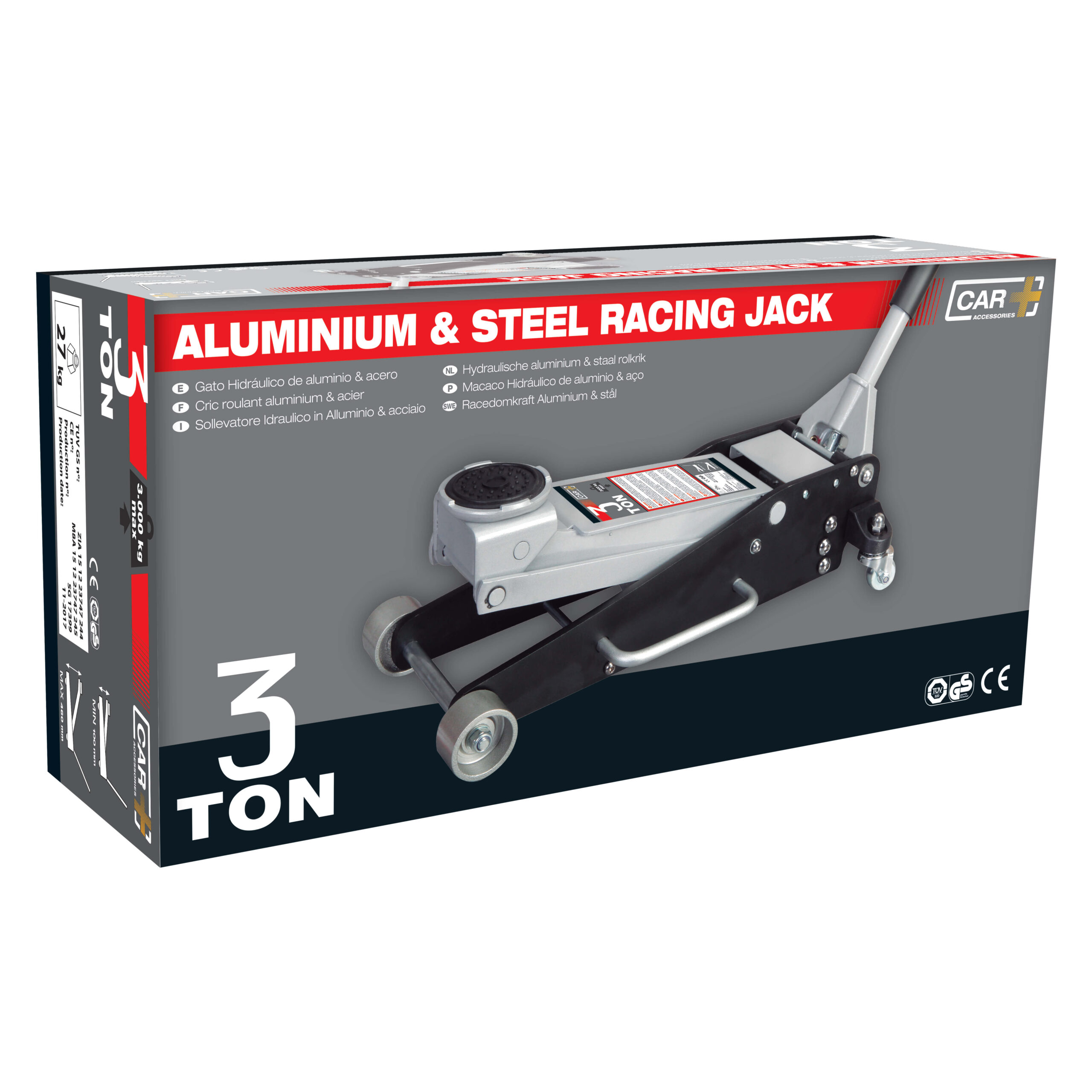 Gato hidráulico de aluminio&acero con capacidad de soporte de hasta 3 toneladas, donde la elevación mínima es de 100mm y una máxima de 460mm. Este gato es capaz de elevar hasta coches con perfil bajo y permite almacenarlo gracias al poco espacio que ocupa el mango. La calidad con la cual ha sido fabricado este producto le permite destacar con respecto a los gatos tradicionales, por ello dispone de homologación TUV y GS lo cual significa que cumple las expectativas con respecto a la calidad exigida por la UE o EEUU.