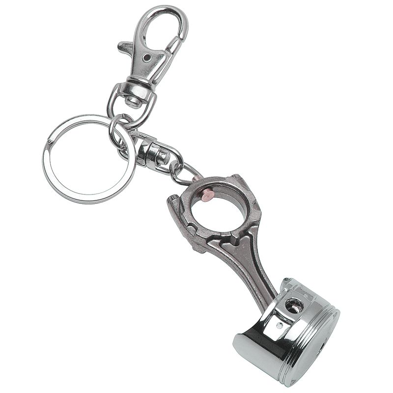 Llavero de doble cierre en forma de pistón para los aficionados al motor. En un tono plateado que hará juego con tus llaves y formará parte de ellas. Con este llavero de 120×24 mm, le otorgarás a tus llaves una imagen de robustez basada en el diseño.