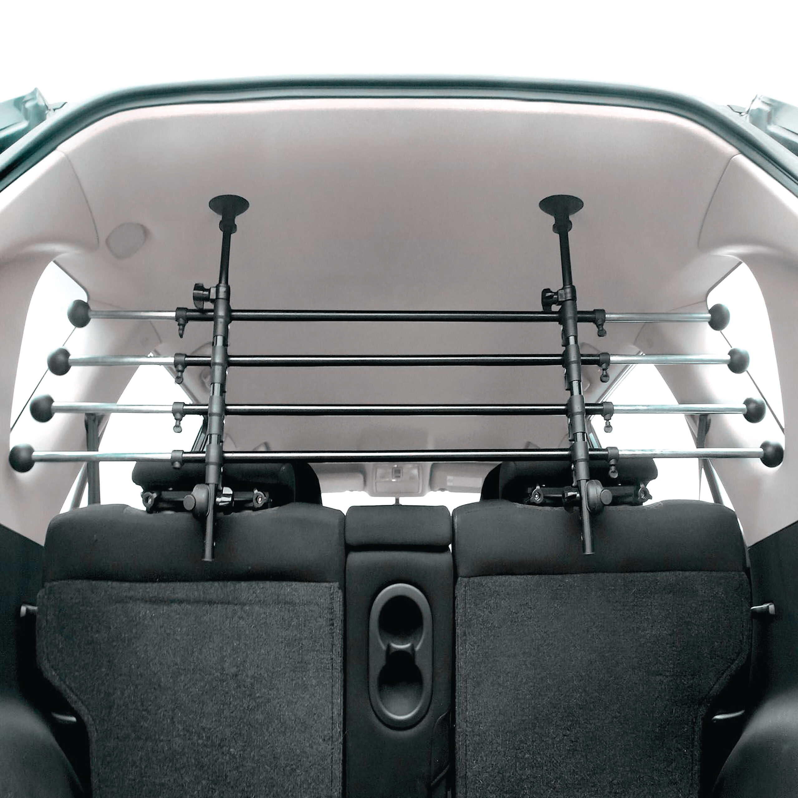 Separador metálico de color negro para perro con un sistema de fijación que permite adaptarlo al tamaño del habitáculo del vehículo. Este separador debe colocarse en la parte trasera del vehículo y te permite disfrutar de la compañía de tu mascota. El material con el cual está fabricado es de una alta calidad y resistente. Este separador se encuentra formado por tres divisores y un sistema que permite la colocación a la altura deseada según las características que tenga el maletero del vehículo. Es fácil de instalar por lo cual, ¡Lo puedes hacer tú mismo y en pocos minutos!