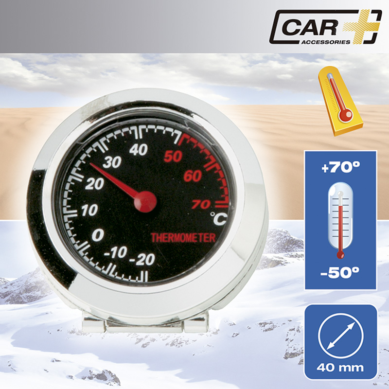 Termómetro para colocarlo en el lugar que desee a fin de estar informado de la temperatura del ambiente y no verse envuelto en un hecho inesperado. Su acabado en cromado le dará una imagen energética a tu vehículo, con el tamaño de 40 mm de diámetro.
