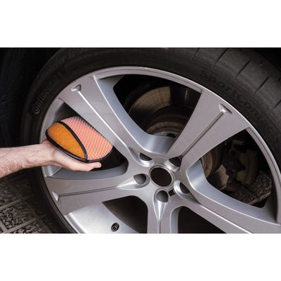 Polish pad for alloy wheels with 2 sides. The meshed side will remove more stubborn dirt and dust, while the soft pile microfibre side will gently polish your wheels and bring out the original shine. The pad has a pocket for your hand to use as a glove and is shaped to be able to get into the corners of your alloy rims.