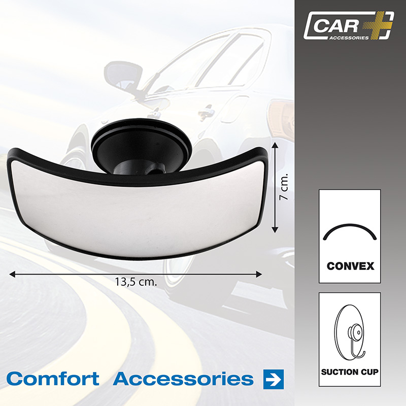 Additional mirror for the interior of your car. The convex glass measures 13.5 x 7 cm gives excellent vision and whether to see the back seats or to reduce blind spots. Comes with suction cup to fix to the windscreen and pivots to the desired angle. Should be used in addition to your original rear view mirror.