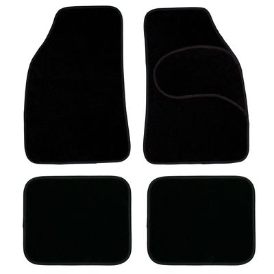 Universal set of 4 basic plain black carpet car mats. The 2 front mats measure 485 x 650mm and the 2 rear mats measure 395 x 325mm. Made of resistant long-lasting carpet material.