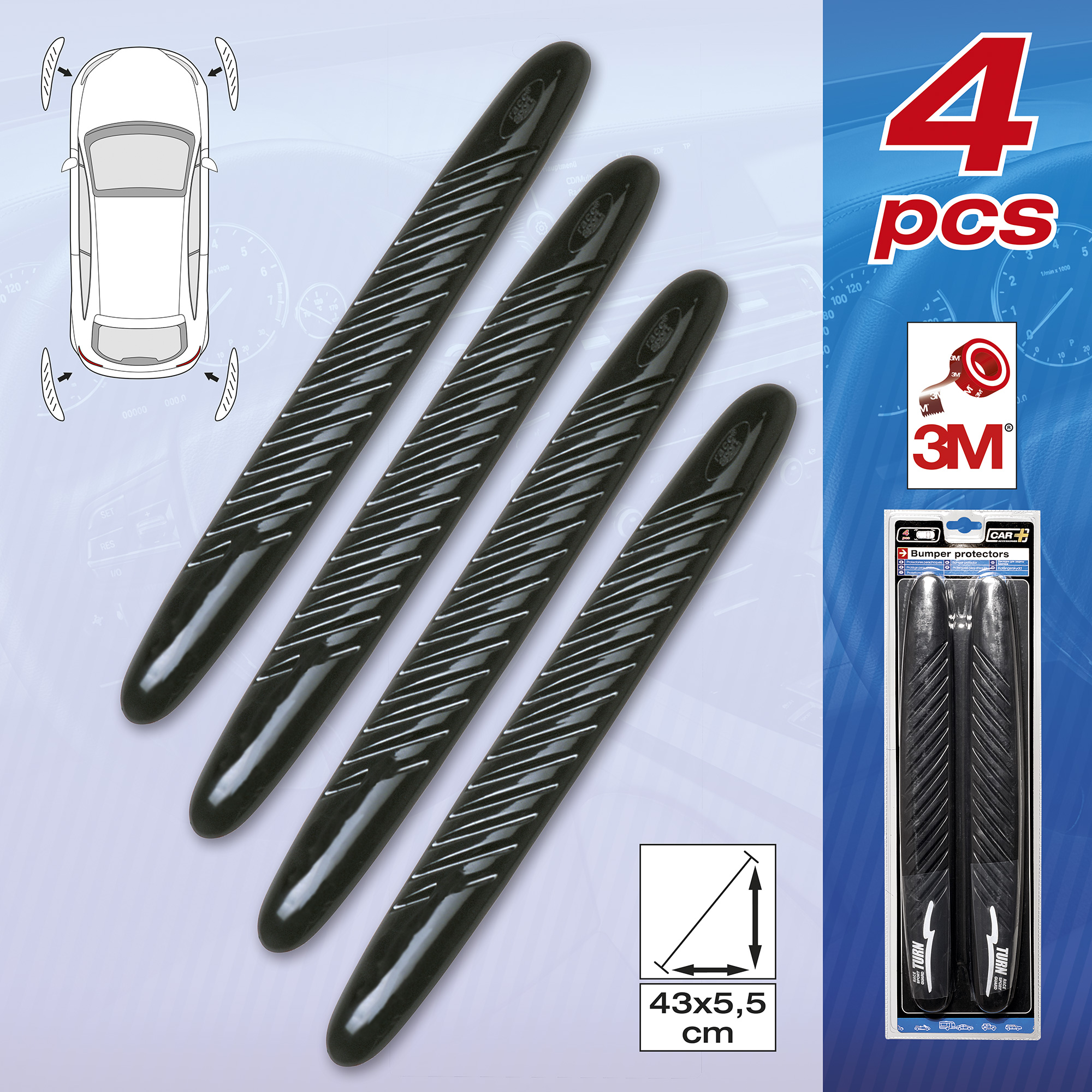 Set of 4 bumper protects in PVC, each measuring 430 x 55mm, to place on the front and rear bumpers of your vehicle to avoid bumps and knocks from damaging your vehicle’s bodywork. he high quality material is flexible and will mould perfectly to your car’s bodywork. The strong adhesive and quality of the product will ensure the protects are long-lasting. Available in 2 different colours – black or grey.