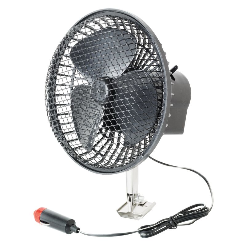 Powerful fan for use in vehicle interior. Connects via the cigarette lighter socket. The fan has 2 positions, fixed and oscillating and comes with a 1.2 metre cable. The diameter of the fan is 15cm and is protected in a robust mesh grill. Includes screws to fit it to the dashboard. The fan can be used in cars, vans, boats or any vehicle with a 12V socket.