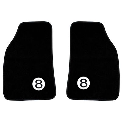 Universal set of 4 black carpet car mats with a stylish and discreet billiard 8 ball design on the front 2 mats. Rear mats are plain black. Made of resistant carpet material, these car mats will give your vehicle a long-lasting customised look. Part of Sumex’s “8 Ball” range of car accessories, including gear knobs, steering wheel covers, seat covers and valve caps.
