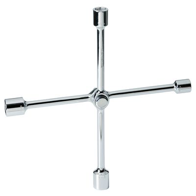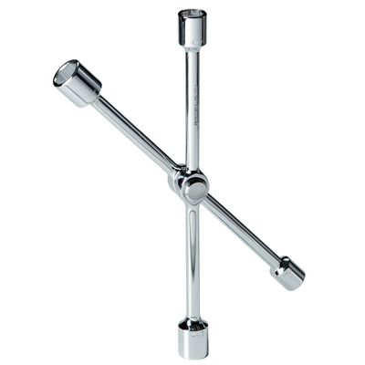 Foldable spinning cross wheel nut wrench spanner with 17mm, 19mm, 21mm and 23mm hex sockets. Made from hardened steel and chrome plated, this wrench will provide great leverage and be long-lasting. High-quality product that’s always useful to keep in the car in case of an emergency. Folds away compactly.