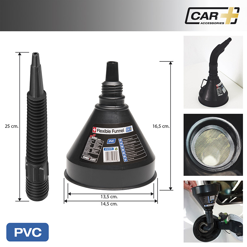 Funnel with filter and detachable flexible tube. Ideal for storage in you car. Hard plastic material will last for ages.