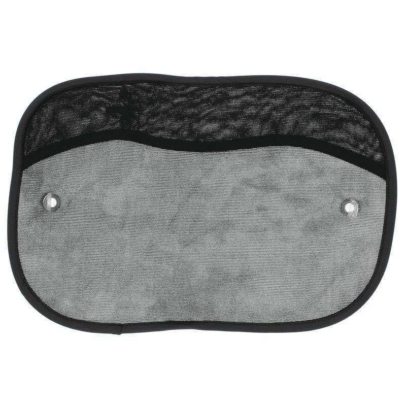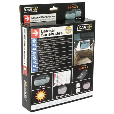 Pack of 2 lateral sunshades measuring 54x37cm with 2-tone mesh layers that vastly reduce the sunlight and UV coming through. Tested in Spanish Sun. Sticks to window uses 2 suction cups that are child friendly. High-quality product and comes with convenient storage bag.