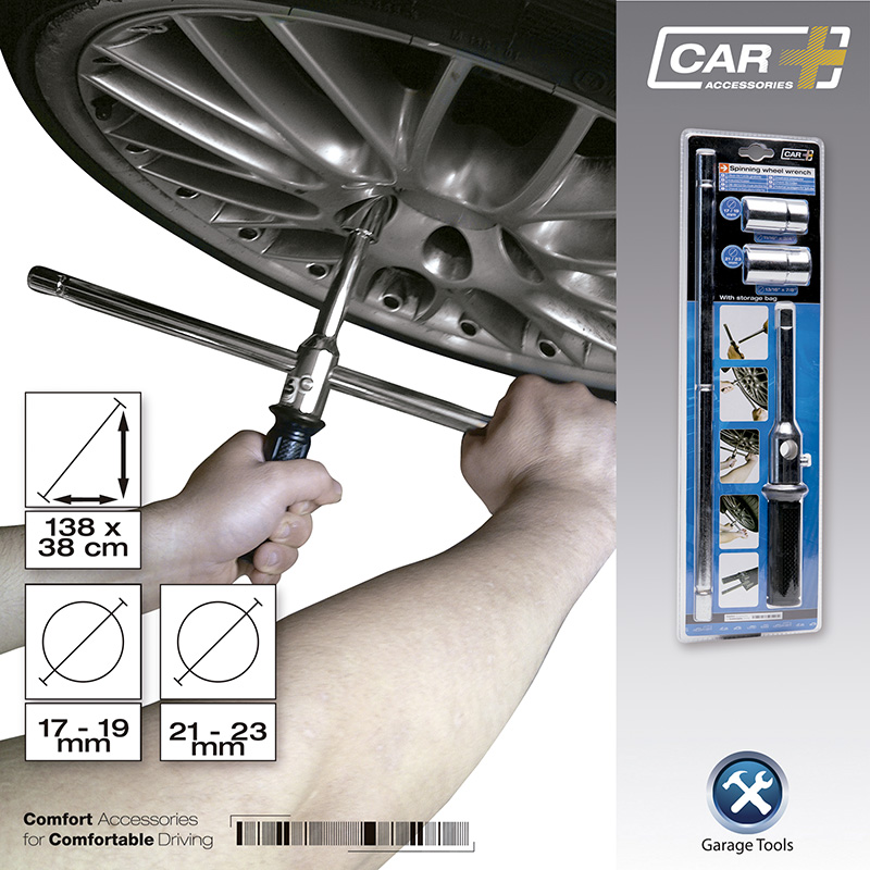High-quality spinning wheel nut wrench that will loosen even the tightest wheel nut. Made of hardened steel with rubber grip for maximum leverage. Comes with hex bolt adaptors for 17mm, 19mm, 21mm and 23mm. Compact to keep in the boot in case you need to change the wheel in an emergency.